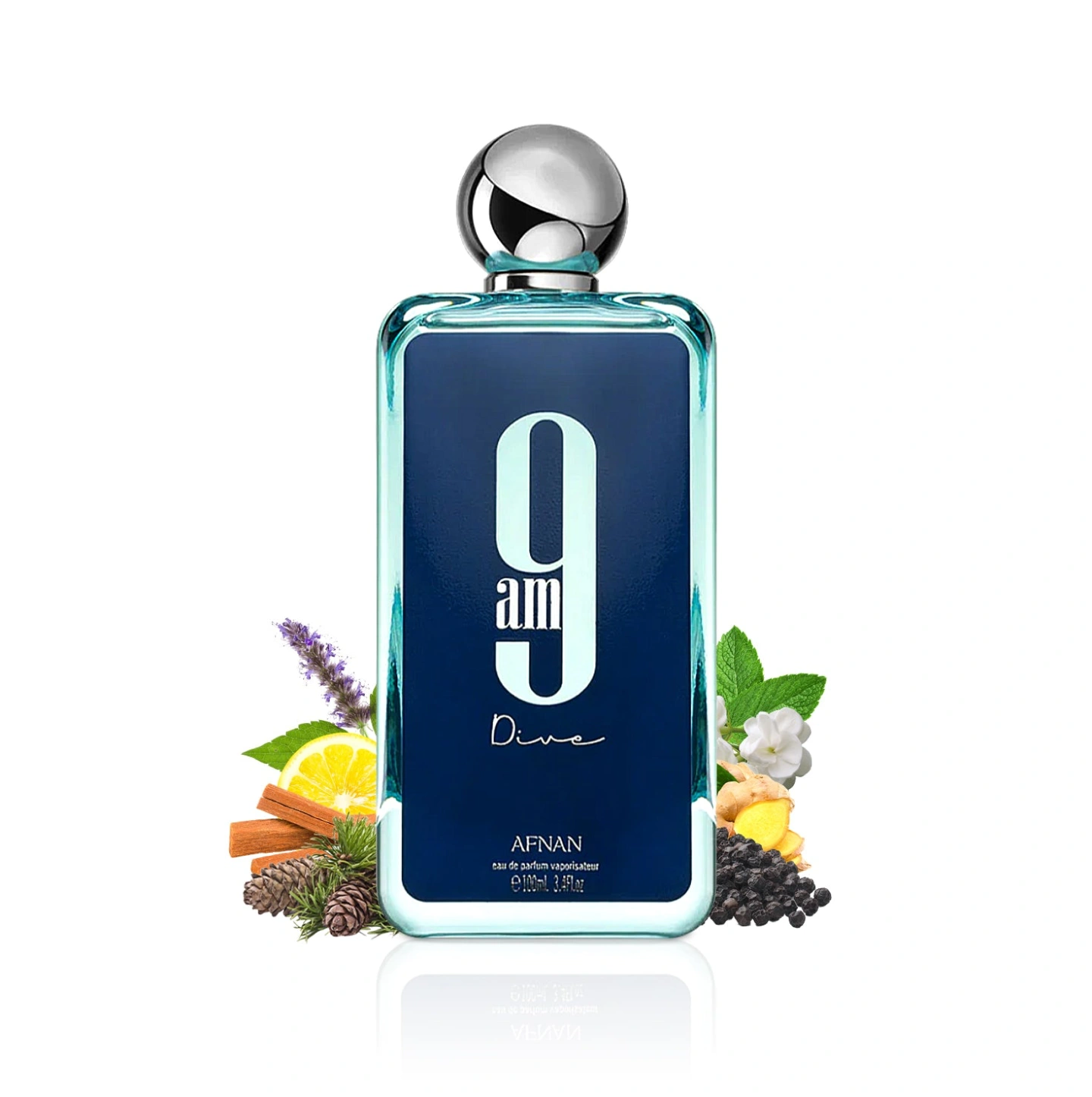 Afnan 9am Dive is an aromatic aquatic Eau de Parfum for men and women, launched in 2022, designed as a fresh, invigorating scent suitable for spring and summer. It features top notes of lemon, mint, blackcurrant, and pink pepper, with a heart of apple, cedar, and incense, and a base of ginger, sandalwood, patchouli, and jasmine