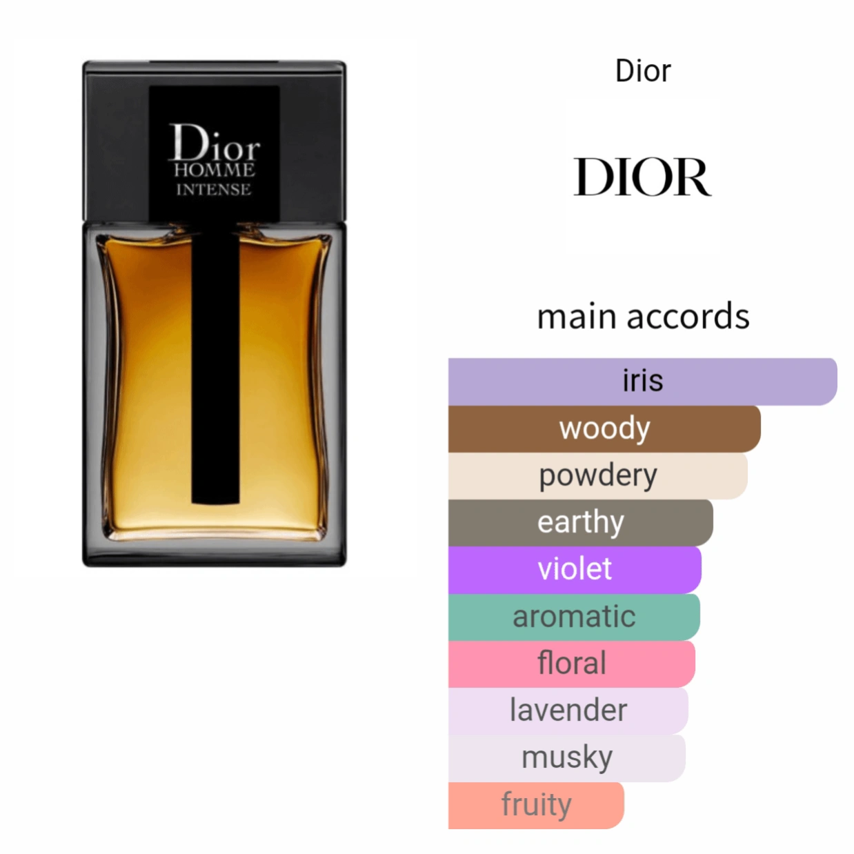Dior Homme Intense is a woody floral musk fragrance for men, launched in 2011, known for its sophisticated, masculine, and sensual character with an intense concentration of iris. It features a blend of a lavender top note, a heart of powdery iris, ambrette seed (musk mallow), and pear, and a base of woody vetiver and Virginia cedar. The fragrance is praised for its quality, longevity, and sophisticated, elegant, and sometimes described as powdery or lipstick-like scent