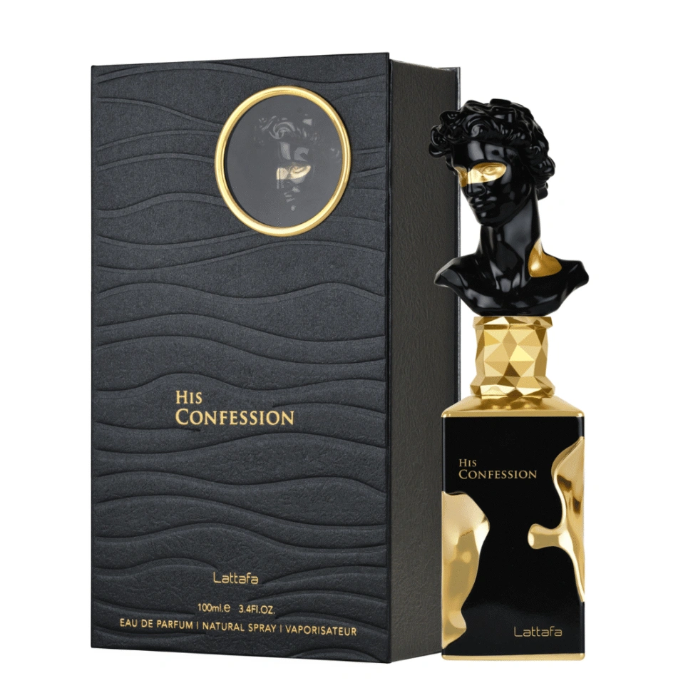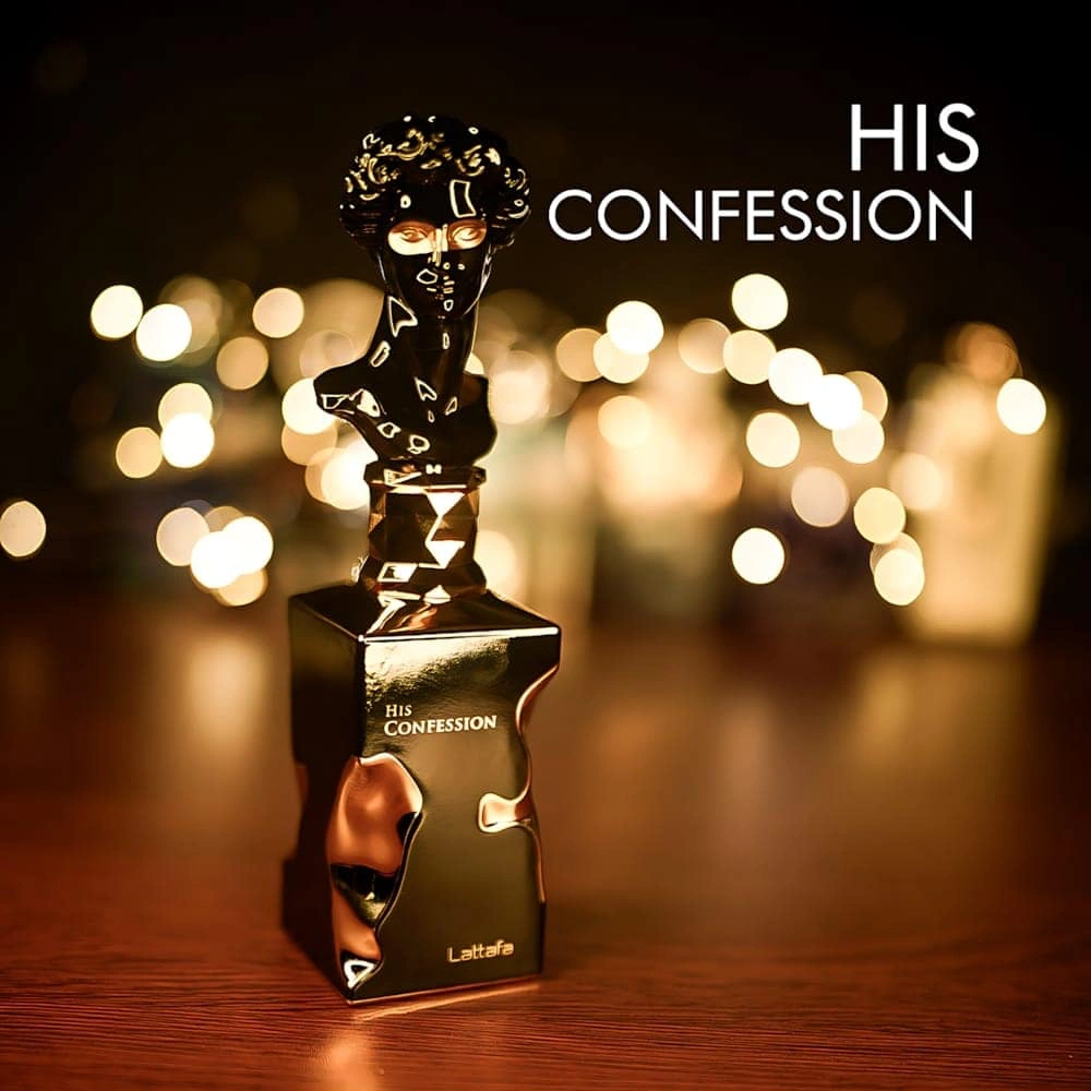 Lattafa His Confession is a 2024 Oriental Woody Eau de Parfum for men, designed as a bold, spicy, and sweet scent reminiscent of Jean Paul Gaultier Le Male Elixir. It features top notes of cinnamon, lavender, and mandarin; a heart of iris, cypress, and benzoin; and a warm, lasting base of vanilla, tonka bean, amber, and incense.
