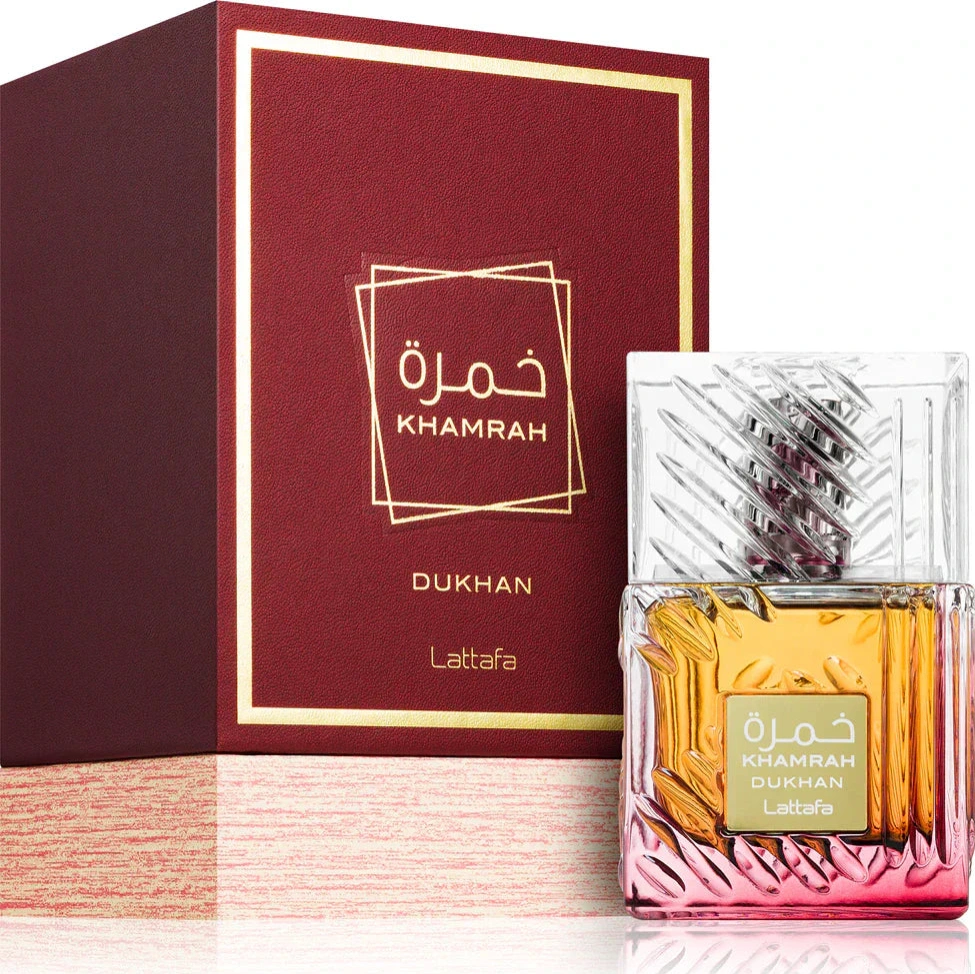 Lattafa Dukhan is a unisex fragrance in the Khamrah line, described as a smoky, spicy, and woody scent inspired by the Middle Eastern tradition of burning perfume. Its composition includes top notes of mandarin, pimento, and spices, a heart of incense, orange blossom, cistus, and patchouli, and a base of tobacco, amber, tonka bean, benzoin, and praline. It is known for being long-lasting with a bold, sophisticated, and addictive aroma.