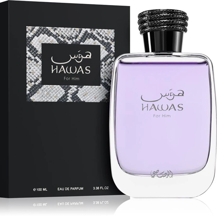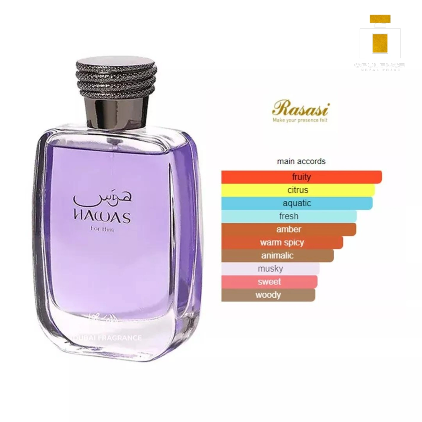 Rasasi Hawas for Him is a 2015 Aromatic Aquatic fragrance for men, blending fruity and citrus top notes like pear, pineapple, and Italian citrus with a sweet, spicy, and floral heart of cinnamon, plum, orange blossom, and aquatic elements like melon and violet.