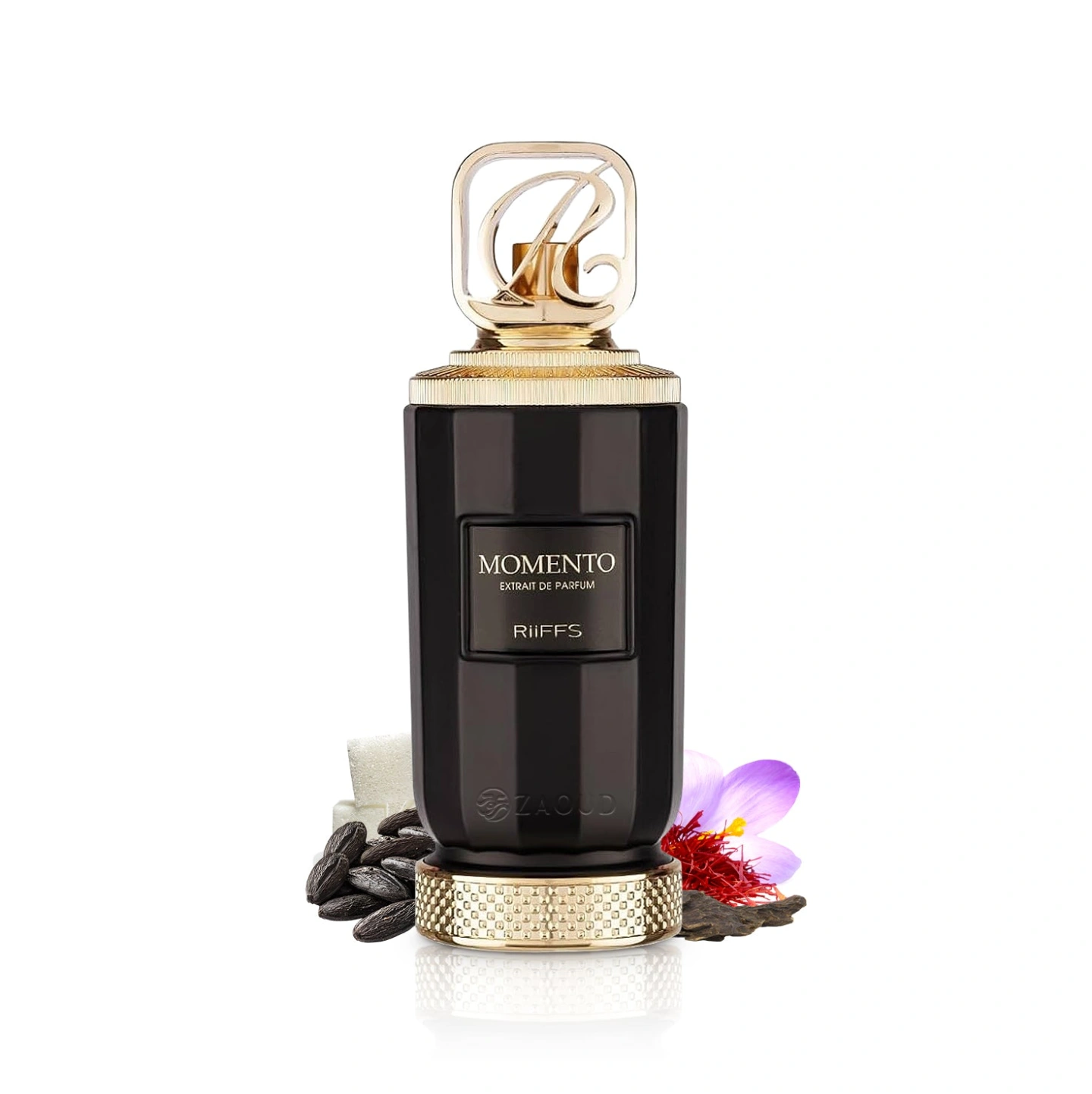 Riiffs Momento is a unisex, woody-spicy fragrance described as bold, luxurious, and long-lasting, designed to capture the essence of unforgettable moments. It has a complex scent profile, opening with notes of bergamot, saffron, and mandarin, transitioning to a heart of rose and oud, and settling on a base of tonka bean, amberwood, and cedar. This Extrait de Parfum is presented in an elegant bottle and is suitable for both special occasions and daily wear, often favored for cooler seasons due to its rich and warm character.